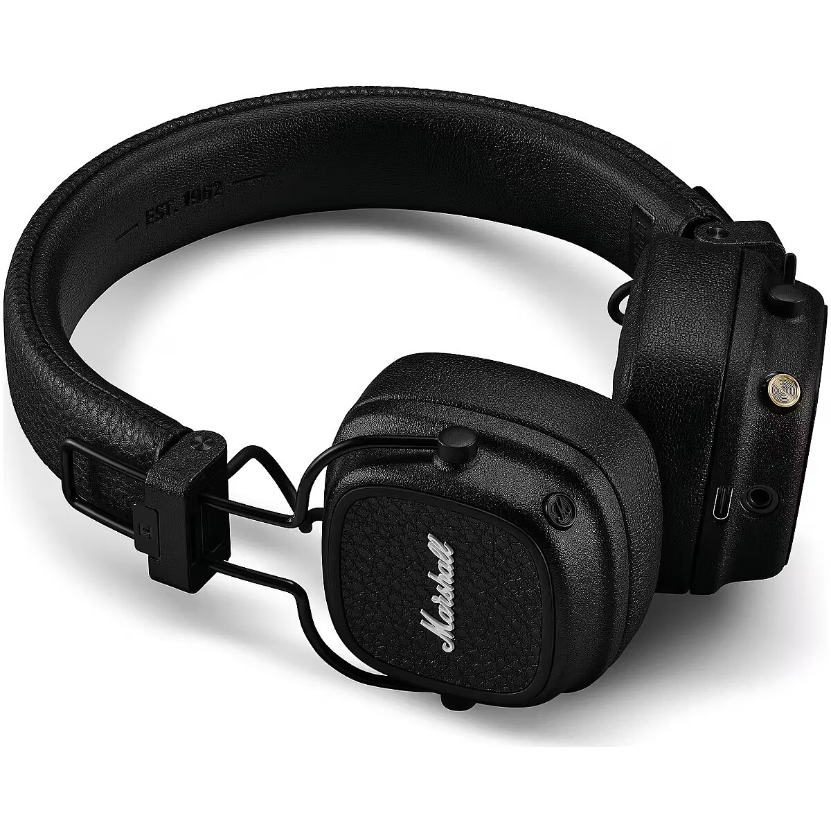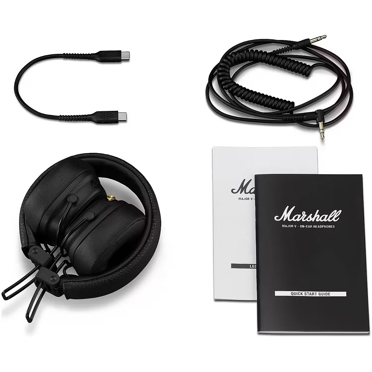 Product specifications: Model: Major V Device type: Wireless on-ear headphones Connection type: Bluetooth 5.3 Frequency range: 20 Hz – 20 kHz Driver size: 40 mm Active Noise Cancelling (ANC): No Microphone: Built-in Controls: Multifunction button Voice assistants: Supported (Google Assistant / Siri) Battery life: up to 100 h Charging time: approx 2 h Fast charging: 15 min = 15 h playback Charging port: USB-C Additional port: 3.5 mm Audio Jack Materials: Metal / Eco-leather / Plastic Weight: 0.186 kg Color: Black Physical parameters: Weight: 0.186 kg Gross weight: 0.38 kg Package dimensions:Length — 0.20 mHeight — 0.08 mWidth — 0.18 m Package contents: Marshall Major V Headphones USB-C Cable 3.5 mm Audio Cable User Manual