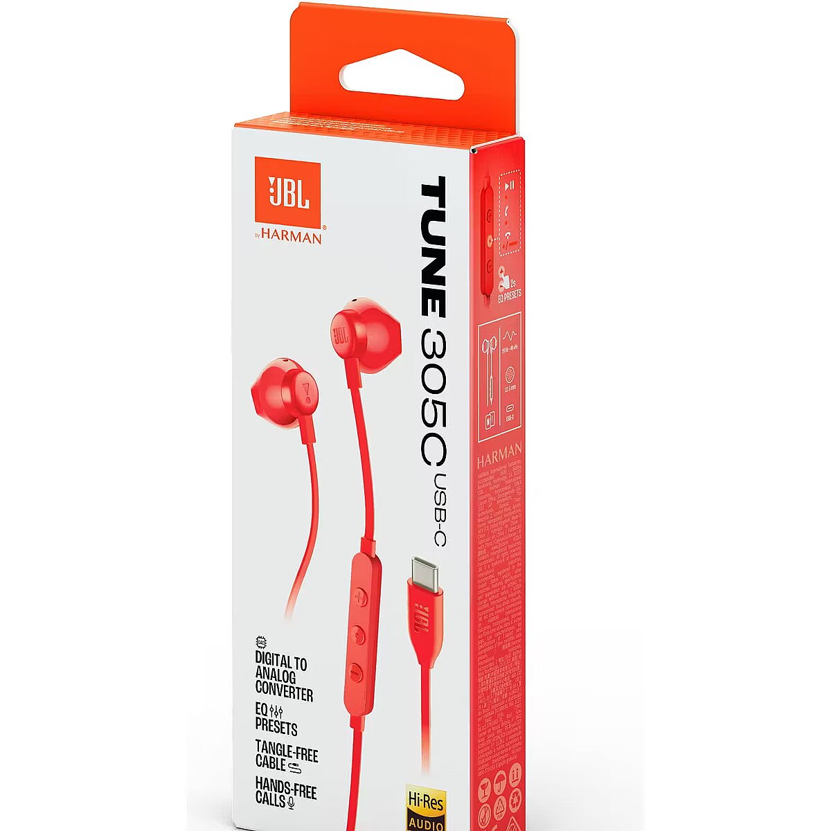 LongDesc - Hi-Res Audio with JBL Pure Bass Sound. Now available to go.Introducing JBL Tune 305CUSB-C earbud headphones. They’re lightweight, comfortable and compact. A pair of 12.5mm dynamic drivers punch out powerful JBL Pure Bass Sound, while the HighResolution Audio support ensures great sound quality. A USB-C connection makes them compatible with a large variety of devices like PCs, mobiles, and gaming devices. In addition, the three-button remote on a tangle-free flat cable lets you control music playback and volume adjustment, EQ presets, as well as answering calls on the fly with a builtin microphone. All this makes the JBL Tune 305CUSB-C your everyday companion, at work, at home, and on the road.JBL Pure Bass sound, Hi-Res certifiedFor over 75 years, JBL has engineered the precise, impressive sound found in big venues around the world. These headphones reproduce that same JBL sound, punching out bass that’s deep, powerful. Hi-Res Audio brings clear and detailed sound quality with a wide frequency range.Compatible with USB-C devicesNeed to connect to a PC, mobile or gaming device? USB-C connectivity ensures compatibility with a wide range of devices.3-button remote with microphoneControl music playback and volume adjustment with a convenient threebutton remote. Got an incoming call? Answer it on the fly with the built-in microphone.EQ presets controlSelect Default, Bass, or Vocal to find the sound that fits your taste via the 3-button remote on the wire.Tangle-free flat cableThe durable flat cable won’t tangle up in knots, even in your bag.