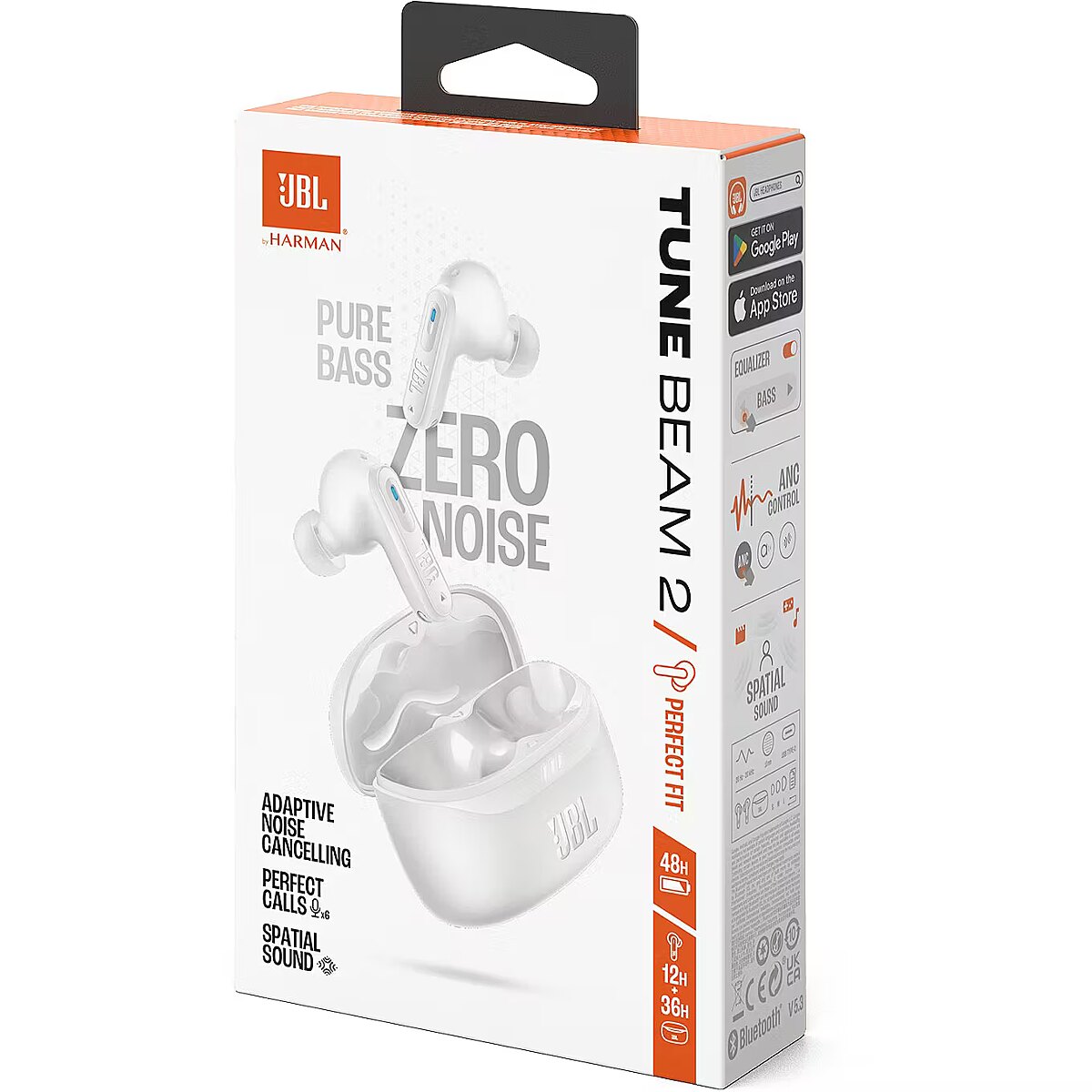 LongDesc - Pure bass, zero noise.Take on your day one song at a time with JBL Tune Beam 2 true wireless earbuds featuring Adaptive Noise Cancelling. They deliver up to 48 hours of exceptional JBL Pure Bass Sound and JBL Spatial Sound, while the ergonomic (and water and dust resistant) design gives you all-day comfort in any weather. Enjoy perfect-sounding calls without ambient noise, all managed using intuitive touch controls. With Adaptive Noise Cancelling and Smart Ambient technology, you can tune out the world, or choose how much you engage with your surroundings. You can even personalize your sound experience with the JBL Headphones app and tailor audio around you with Personi-Fi 3.0. And with JBL’s iconic ghost design, the aesthetics are as great as the technology. Pop in the JBL Tune Beam 2 and experience your world your way.