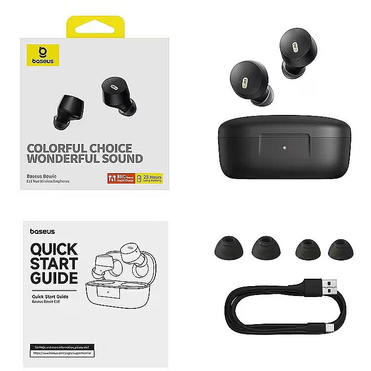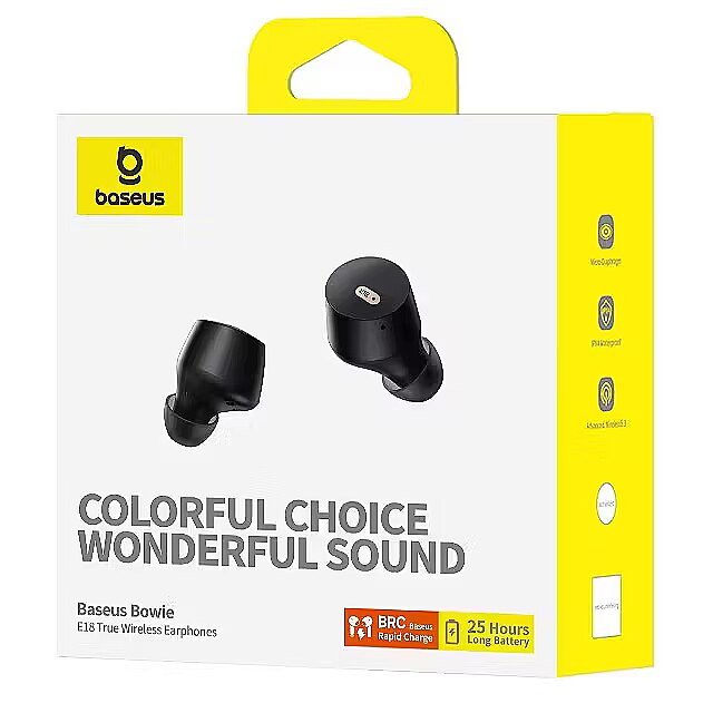 description_en - The Baseus Bowie E18 are true wireless earbuds that combine reliable connectivity and long battery life. With Bluetooth 5.3, they offer stable audio playback and low latency. Their IPX4 rating provides resistance against sweat and light splashes, making them suitable for workouts or commuting.