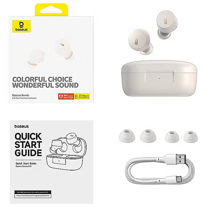 description_en - The Baseus Bowie E18 are sleek and compact true wireless earbuds designed for everyday listening. They deliver balanced audio with clarity in the mids and decent bass, making them great for music, podcasts, and calls. They connect via Bluetooth and feature a low-latency mode that improves responsiveness during video playback or mobile gaming.