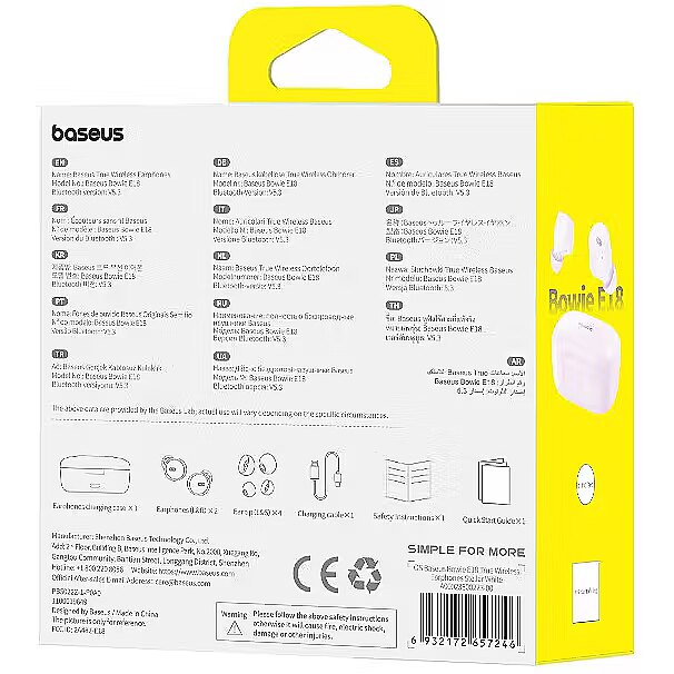 description_en - The Baseus Bowie E18 are compact true wireless earbuds with ergonomic design for comfortable all-day use. They connect via Bluetooth 5.3, providing stable and efficient wireless transmission. The earbuds feature IPX4 water resistance and touch-sensitive controls for music playback, volume adjustment, and calls.