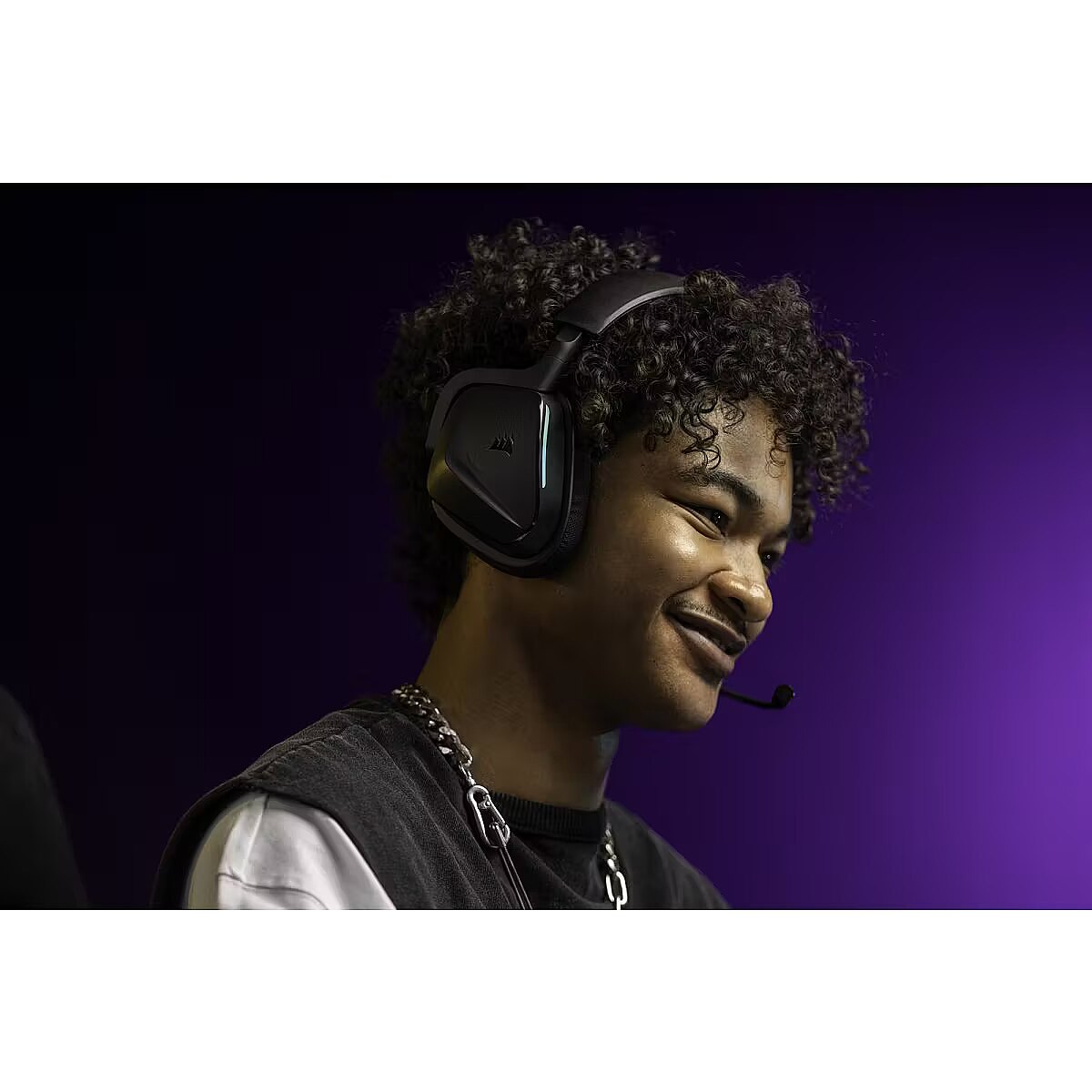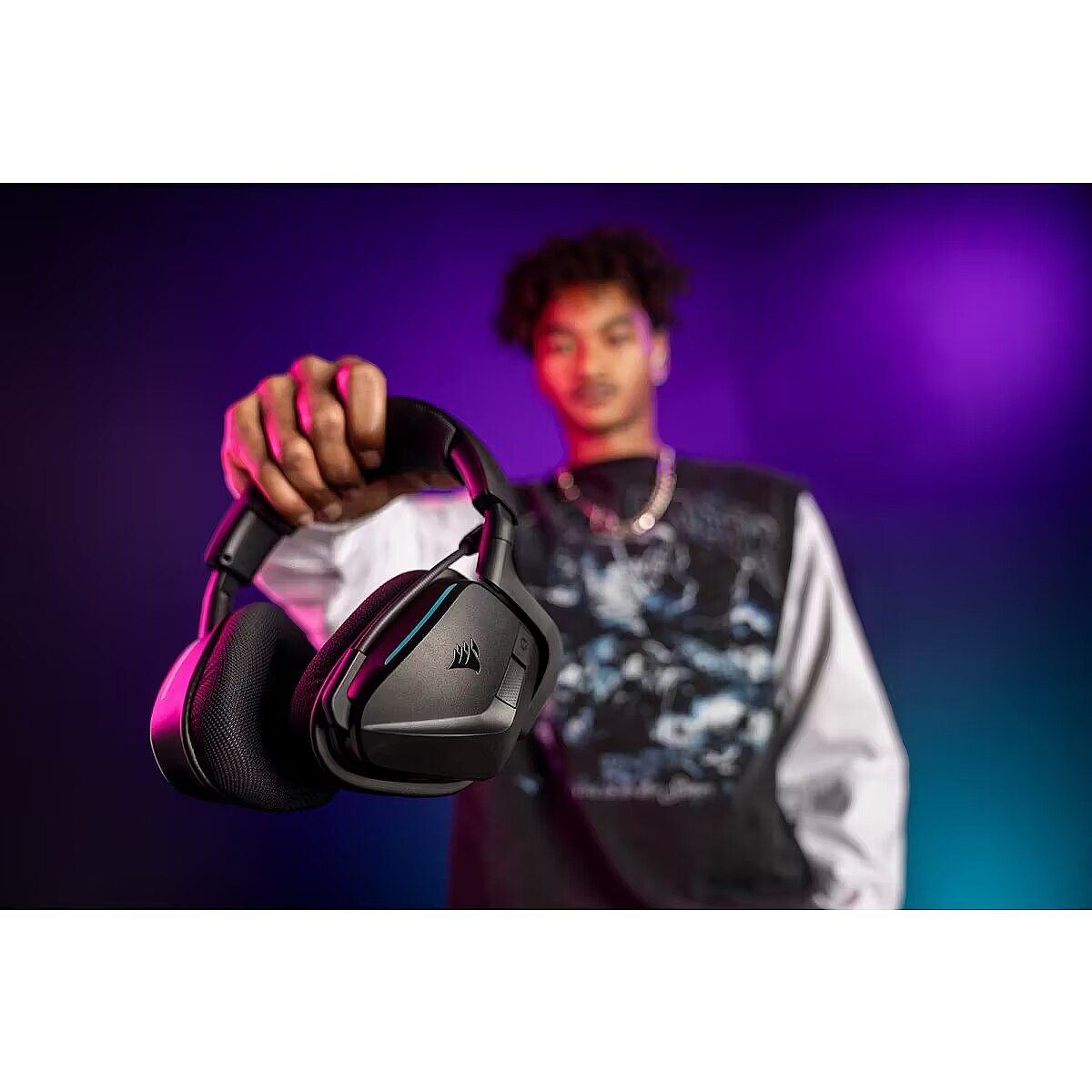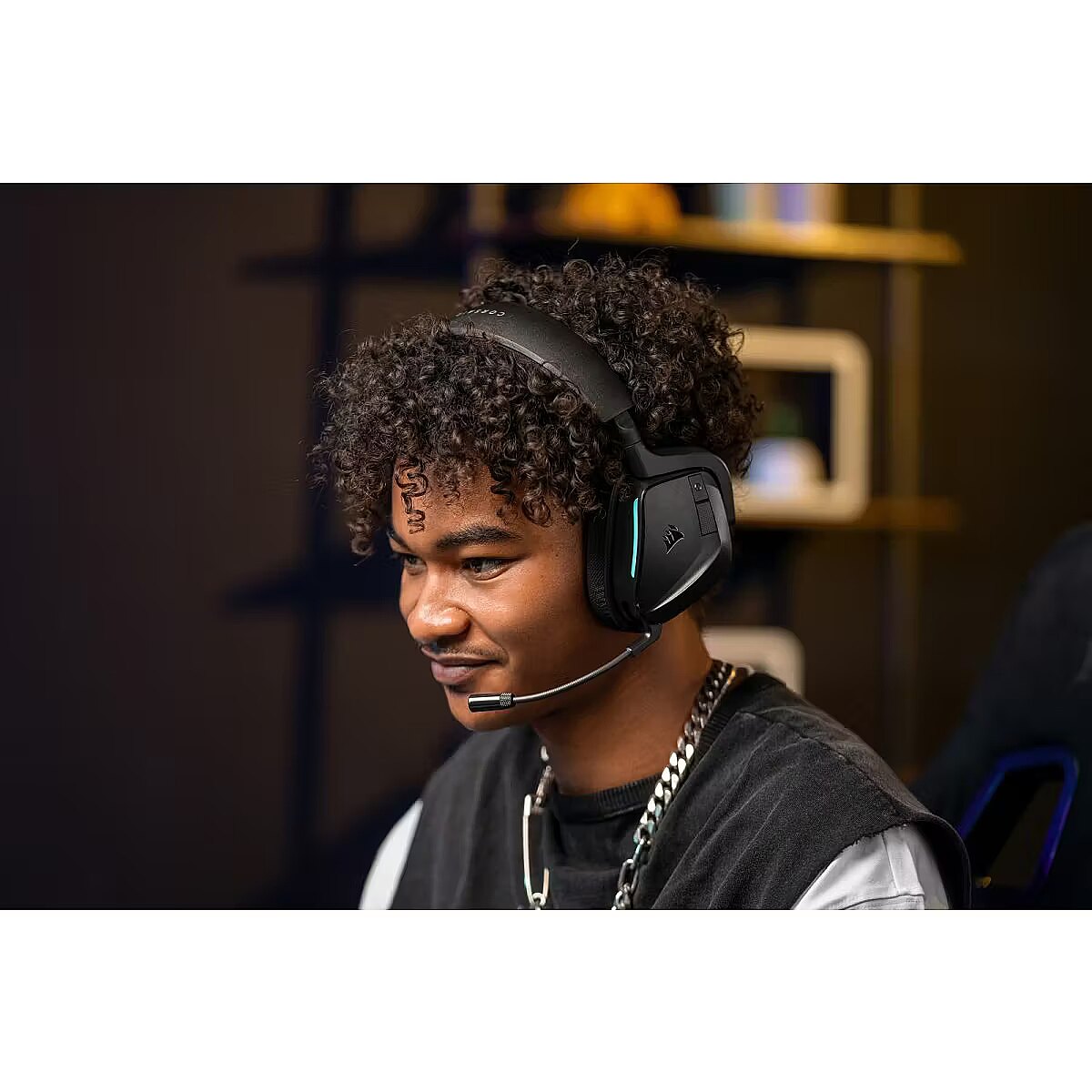 Description - Headset Void Wireless 2.0 Dolby Atmos Spatial Audio: Experience dynamic and directional audio that lets you pinpoint every footstep, explosion, and movement with incredible directional accuracy. Ultra-fast 2.4GHz wireless or Bluetooth: Stay connected with low-latency 2.4GHz wireless for high-performance gaming and Bluetooth for added versatility. Instantly switch between connections with the press of a button. Dynamic Drivers for Superior Audio: Custom-tuned 50mm drivers deliver dynamic and high-fidelity soundscapes, making every soundtrack, effect, and in-game moment more impactful. Dual Wireless Compatibility: Effortlessly switch between PC, PlayStation, Nintendo Switch, and Mobile for premium audio with the press of a button. Long-Lasting Battery: Play for days with up to 70 hours of battery life. When youre running low, a 15-minute charge provides up to 6 more hours of battery. Comfort You Can Count On: Stay cool and comfortable during long gaming sessions with memory foam ear cushions wrapped in breathable microfiber fabric. Crystal-Clear Communication: The omni-directional microphone with NVIDIA Broadcast technology cuts through background noise, ensuring your team hears you clearly. Custom Audio and Lighting: Take control of your sound and style with CORSAIR iCUE. Customize EQ settings, load pre-tuned profiles, and personalize RGB lighting.