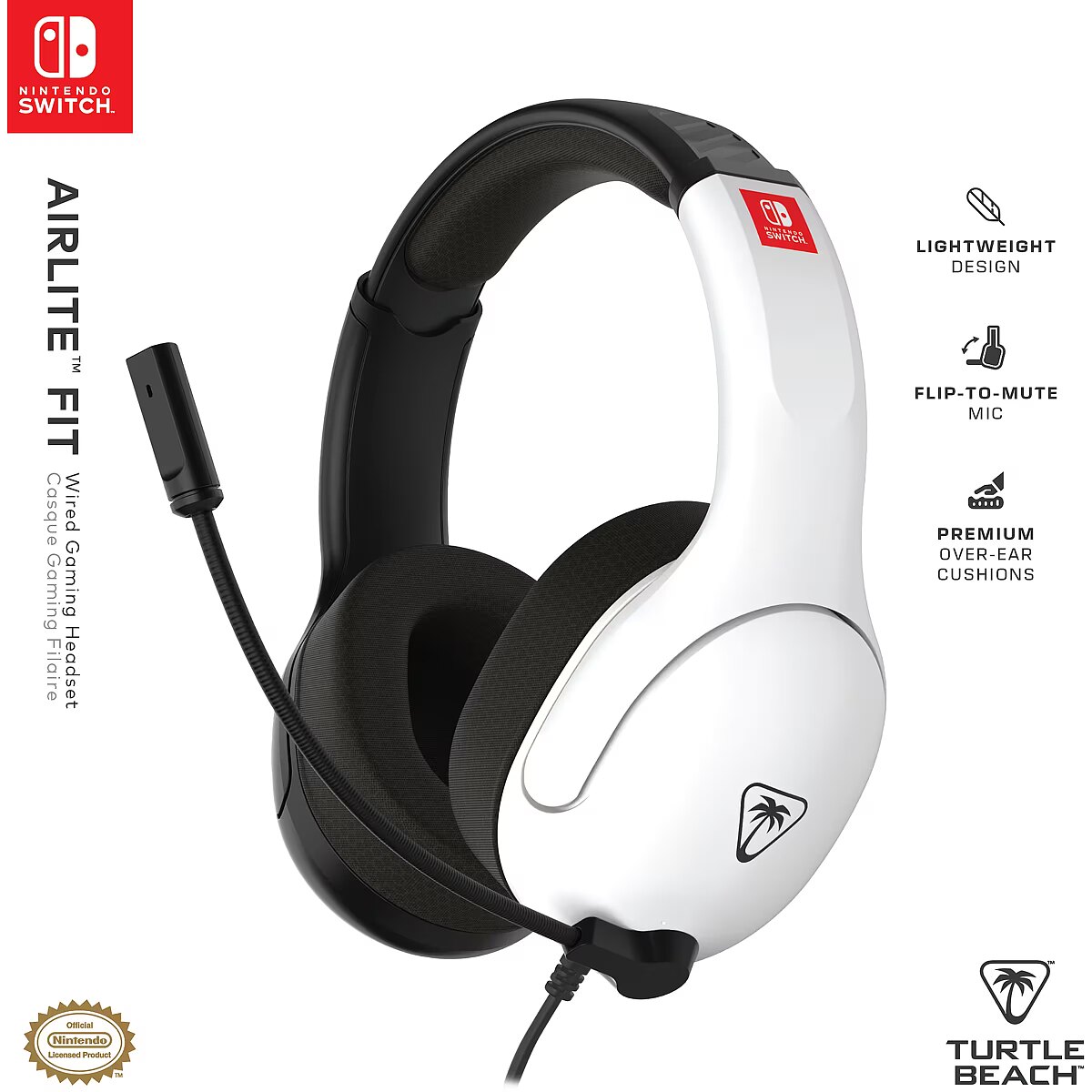 LongSummaryDescription - Turtle Beach Airlite Fit Black and White Wired Gaming Headset with Flip-to-Mute Mic, Over-Ear Premium Comfort and 40mm Speakers. Officially Licensed for Nintendo Switch. Product type: Headset. Connectivity technology: Wired. Recommended usage: Gaming. Headphone frequency: 20 - 20000 Hz. Cable length: 1.15 m. Weight: 228 g. Product colour: Black, White
