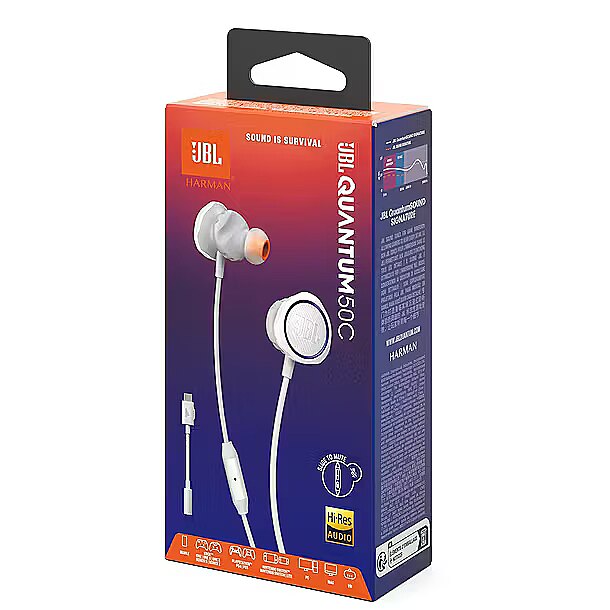 LongSummaryDescription - JBL Quantum 50C. Product type: Headset. Connectivity technology: Wired. Recommended usage: Gaming. Headphone frequency: 20 - 40000 Hz. Weight: 21.5 g. Product colour: White