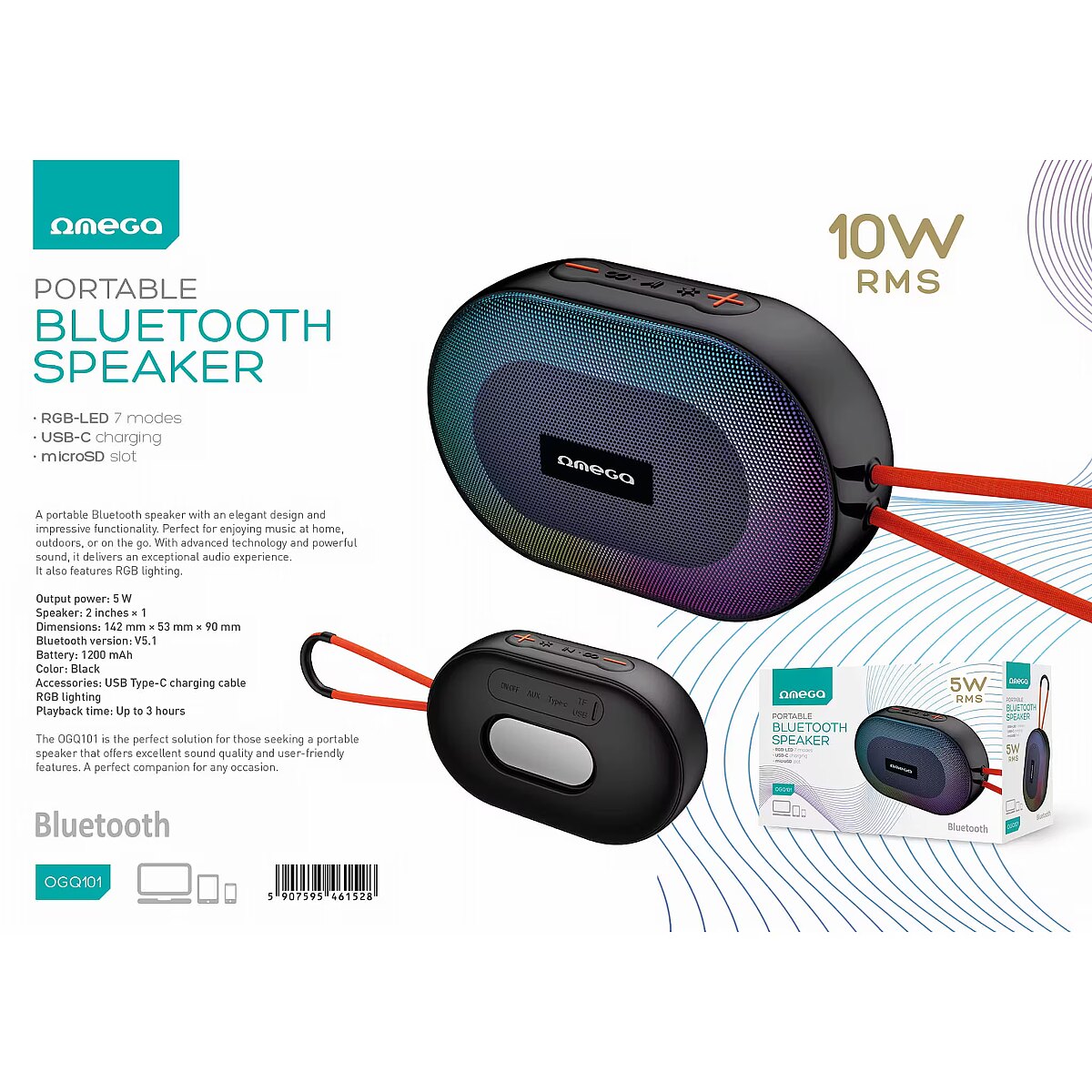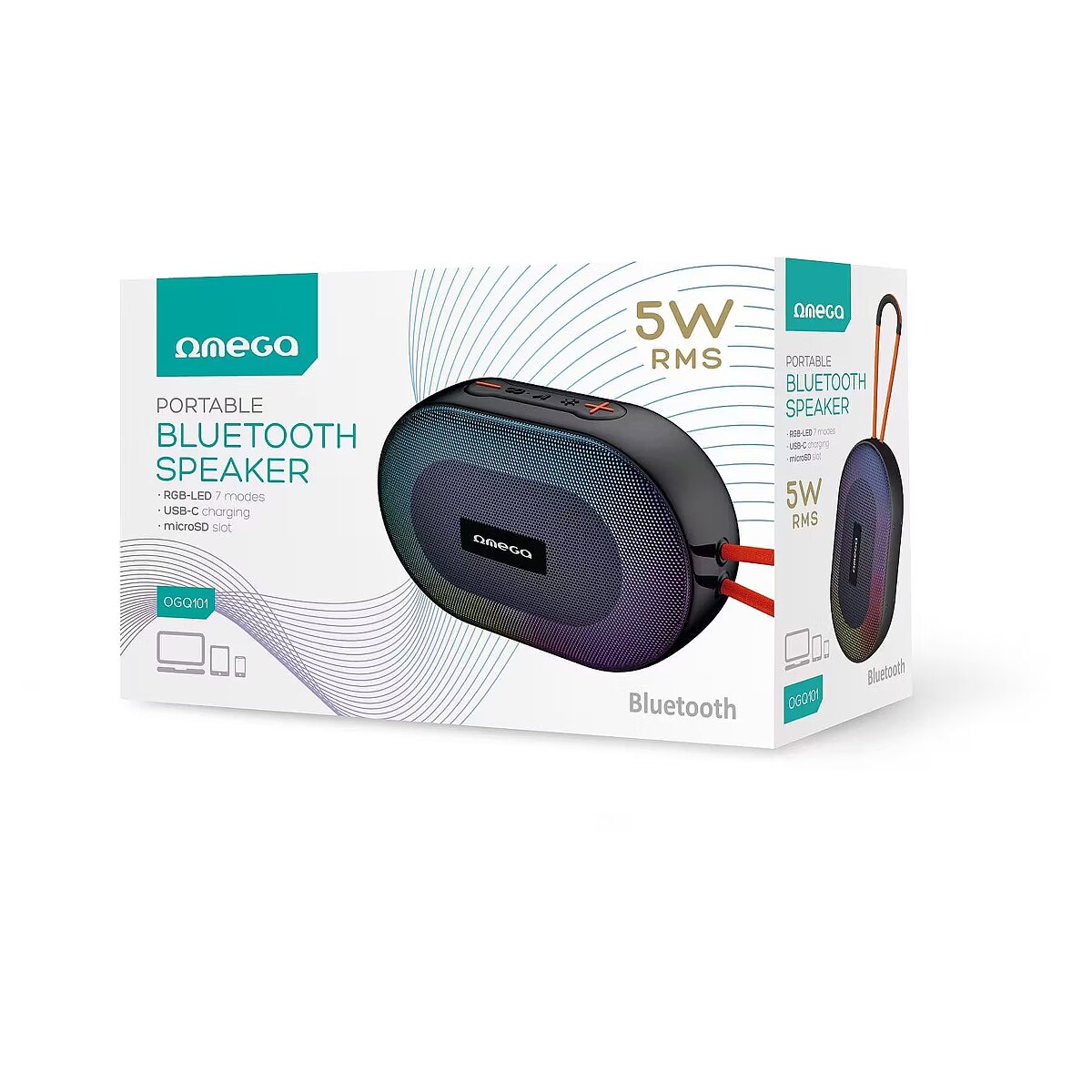 description_en - The Omeg OGQ101 portable Bluetooth speaker is the perfect solution for listening to music and podcasts anytime, anywhere. Thanks to the wireless Bluetooth connection, you can easily pair it with your phone, tablet or laptop and enjoy your favorite music without the hassle of cables. Thanks to the built-in battery, you can enjoy music for up to 3 hours in a row. In addition, seven RGB lighting modes create a mood and bring colorful vibrancy to the listening experience. The compact design makes it easy to carry, easily fitting into any bag. High-quality sound creates a pleasant listening experience at home, outdoors or on tour. Output power: 5 W - ensures clear and pure sound even at high volume 2-inch speaker element - compact, but with rich sound quality Bluetooth 5.1 ensures stable connection 7-mode RGB lighting 1200 mAh integrated battery allows for long listening to music on a single charge Battery lasts up to 3 hours Fast and convenient charging with USB-C charging cable Dimensions: 14.2 × 5.3 × 9 cm - easy to carry