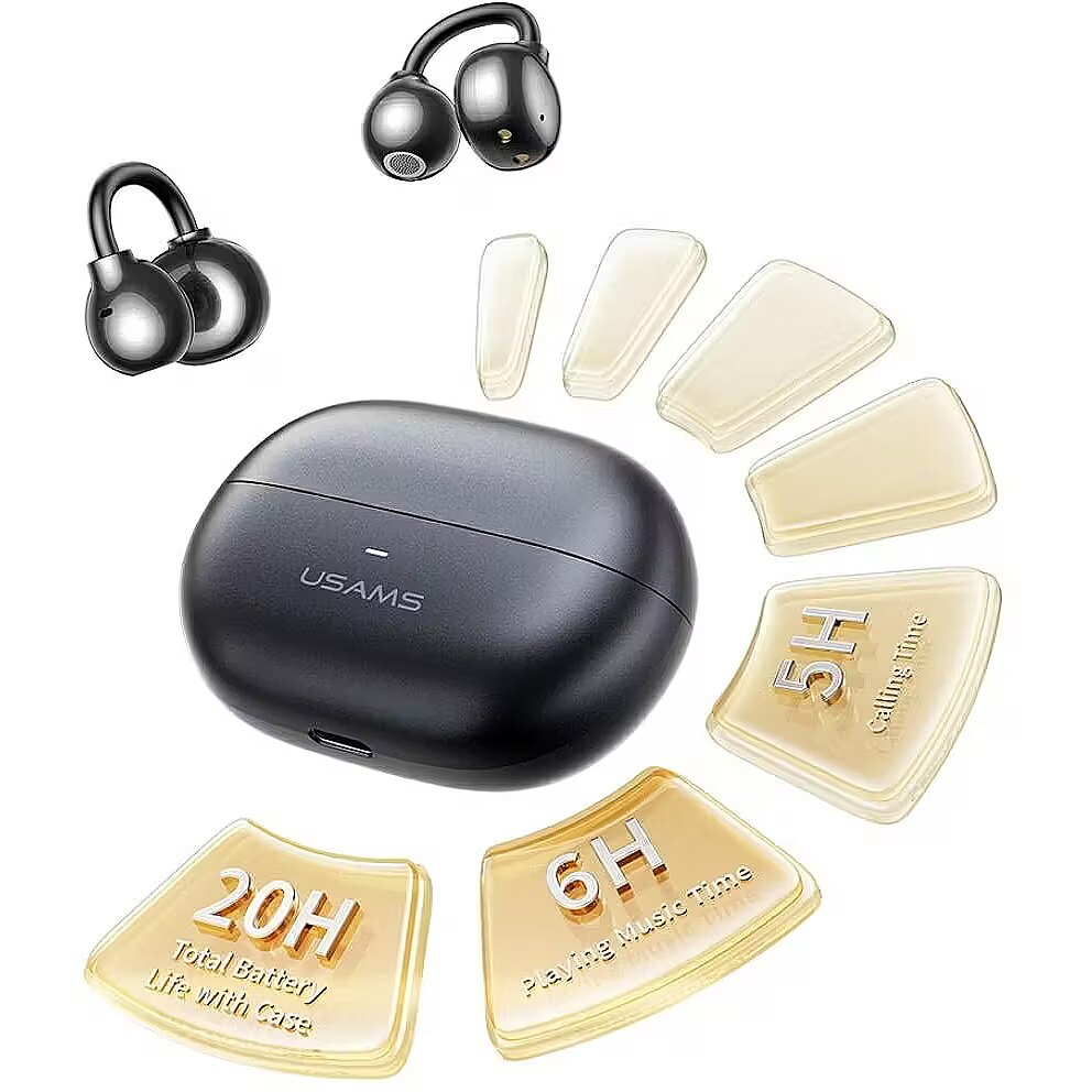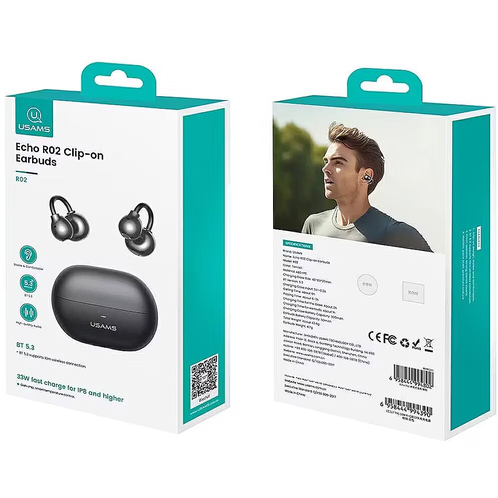 Description - USAMS Echo R02 Clip-on Wireless Bluetooth Headphones USAMS is a renowned brand specializing in the design and production of premium electronic accessories. Known for its innovative approach and stylish design, it offers a wide range of products, including mobile phone accessories, chargers, and other electronic devices. Focusing on quality, durability, and functionality, it combines modern technology with exceptional craftsmanship. Unique appearance and exceptional quality The ergonomic U- shape and ultra-lightweight construction made of skin-friendly memory silicone ensure a comfortable and stable fit. Even during intense movement, the headphones remain securely in place, increasing comfort. Performance and functionality The headphones are equipped with the latest Bluetooth version 5.3 , which ensures a stable connection and quick pairing with devices. Docking station and power bank in one Enjoy up to 7 hours of uninterrupted music playback on a single charge. The charging case also doubles as a power bank, allowing you to listen to your favorite tracks longer. So you'll never have to worry about running out of battery again! Control with touch! The introduction of a touch panel to the headphones allows for intuitive control using simple touch gestures. This modern technology simplifies their operation, making them even easier and more enjoyable to use!