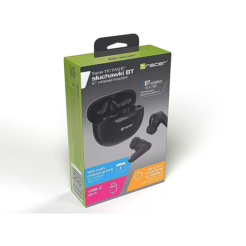 Description - TRACER T10 TWS BT Headphones Do you need headphones that keep up with your pace in the urban jungle every day? Do you enjoy listening to music while running or cycling? The Tracer T10 TWS BT headphones are designed specifically for active lifestyles. Long battery life, wireless functionality, and a built-in microphone are just some of their features. Wireless Bluetooth 5.4 USB-C Charging Port Range up to 10 meters Charging Case with 300 mAh Power Bank Answer Calls via Built-in Touch Panel Immersive Sound Quality Built-in Microphone Stylish Design and Lightweight Construction Compatible with Any Device Enjoy Wireless Freedom Experience true wireless freedom during workouts, walks, or relaxing at home. Tracer T10 TWS BT connects via advanced Bluetooth 5.4 to any compatible device. With a range of up to 10 meters, enjoy your favorite music anywhere without tangled cables. Charging Case with Built-in 300 mAh Power Bank The compact, lightweight design makes it easy to carry the headphones in your bag, compartment, or pocket. The practical case doubles as a charger and power bank, preventing loss or damage. The built-in battery allows up to 5 hours of continuous music playback or calls. When the headphones battery runs low, simply place them in the case and within minutes theyre ready to use again. Immersive Sound Break free from limits and boost your workout motivation. Deep bass, crisp highs, and clear, distortion-free audio energize your training sessions. Hands-Free Stereo Calls The built-in microphone supports HSP, HFP, A2DP, SBC, AAC, and AVRCP profiles, allowing high-quality stereo calls. Answer incoming calls directly with the built-in button without removing your device from your pocket. Noise-canceling technology ensures your voice is heard clearly. Ergonomic and Comfortable The elegant and lightweight Tracer T10 earbuds are designed to fit securely in your ears without falling out during activity. The unique earbud shape ensures a safe, comfortable fit even during intense workouts. Bluetooth Wireless Communication Bluetooth technology provides a stable, efficient connection up to 10 meters, allowing seamless audio streaming without cables. Noise-Reducing Microphone Equipped with a sensitive, noise-reducing microphone for crystal-clear voice communication.