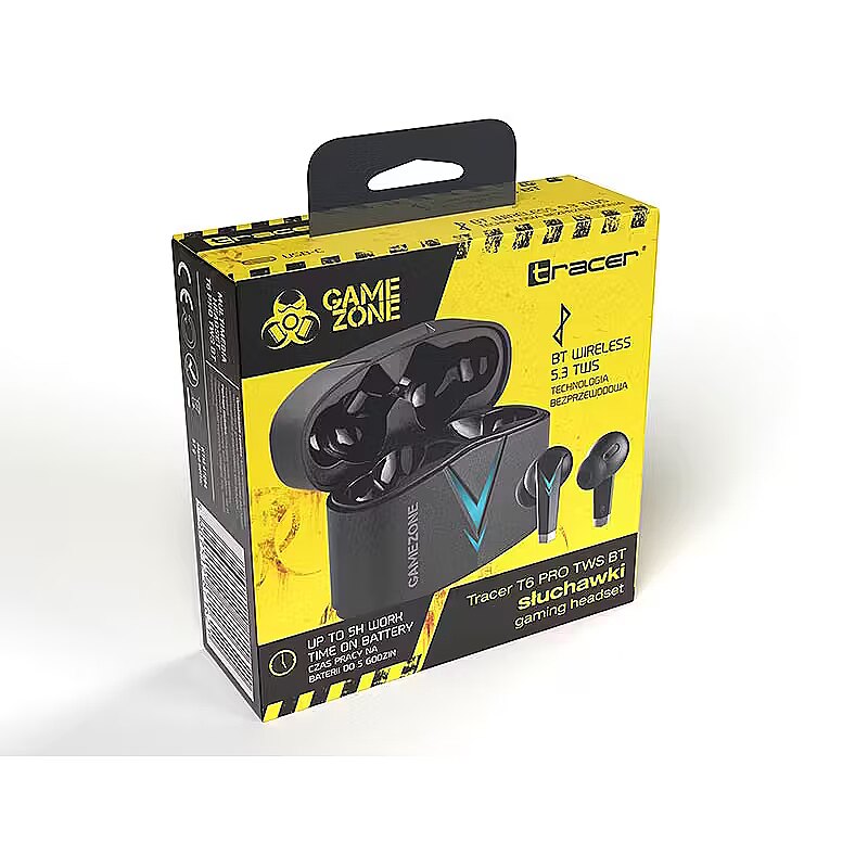 Description - TRACER GAMEZONE T6 PRO TWS BT Headphones The Tracer wireless headphones are part of the GAMEZONE series, designed for gamers who value functionality and comfort during long gaming marathons. Choose Tracer headphones and lead your team to victory! Bluetooth 5.3 Built-in Microphone Up to 5 Hours of Battery Life Charging Case 300 mAh USB-C Port Special Gaming Mode - 65 ms Latency Touch Controls Immersive Gaming Experience Tracer headphones deliver high-quality sound that allows you to fully experience the realism of the game world. Enjoy clear audio not only for music but also for in-game environmental sounds. The built-in microphone ensures smooth, uninterrupted communication with teammates, and intuitive touch controls provide convenient operation without taking your focus off the game. The special gaming mode reduces latency to 65 ms, making gameplay even more enjoyable. Stay Ahead of the Game Equipped with Bluetooth 5.3 technology, Tracer headphones ensure smooth, stable data transfer over a wide range. You wont have to worry about transmission delays affecting your chances of winning. Whether youre planning a gaming marathon or simply listening to music, Tracer headphones easily connect to consoles, smartphones, or MP3 players. Comfortable to Wear Tracer headphones feature a built-in 300 mAh battery, providing approximately 5 hours of continuous gameplay or music listening. Recharge them simply by placing them in the included charging case. Their small, lightweight design allows hours of comfortable use. Touch controls add convenience, while the futuristic design complements your gaming setup perfectly. Wireless Bluetooth Communication Bluetooth technology enables cable-free connectivity. The module provides a stable and efficient connection with another device, ensuring high-quality audio and smooth playback within a 10-meter range. Noise-Reducing Microphone The sensitive, noise-canceling microphone ensures crystal-clear voice communication. Tracer GameZone Series This product line is designed for demanding gamers who expect advanced features and high performance from every piece of equipment. GAMEZONE is a true gamers zone, offering gear that helps you tackle even the toughest challenges. High-quality materials ensure durability even during intensive use, and additional features allow you to customize the headphones to your exact needs.