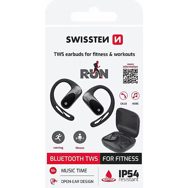 description_en - The SWISSTEN RUN Bluetooth earbuds are designed for active users who demand comfort, performance, and complete freedom of movement. The innovative open-ear design lets you enjoy your music while staying aware of your surroundings, making them ideal for running, fitness, and everyday use. Lightweight and durable with IP54 protection, they withstand workouts in any weather, while Bluetooth 5.4 ensures a stable, fast connection. The charging case extends standby time up to 40 hours, so your music and calls are always ready to go. Open-ear design for maximum comfort