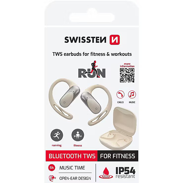 description_en - The SWISSTEN RUN Bluetooth earbuds are designed for active users who demand comfort, performance, and complete freedom of movement. The innovative open-ear design lets you enjoy your music while staying aware of your surroundings, making them ideal for running, fitness, and everyday use. Lightweight and durable with IP54 protection, they withstand workouts in any weather, while Bluetooth 5.4 ensures a stable, fast connection. The charging case extends standby time up to 40 hours, so your music and calls are always ready to go. Open-ear design for maximum comfort
