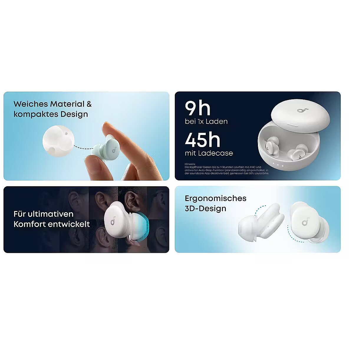 Description - Soundcore Sleep A30 Wireless Headphones in White Noise Cancelling Sleep with ANC: Intelligent ANC with Ear Canal Adaptation Tech dynamically adapts to your ears, providing deeper noise reduction and a peaceful night. Effectively blocks out snoring, pet sounds, household appliances, and street noise. Adaptive Snore Masking: The charging case monitors and analyzes snoring sounds, and the headphones continuously optimize masking sounds so your sleep isn't disturbed by your partner's snoring. AI Brainwave Audio for a Restful Sleep: Binaural sounds deliver different frequencies to each ear, helping to synchronize your brainwaves with calming patterns, promoting relaxation and restorative sleep. All-Night Comfort for Side Sleepers: Ultra-soft silicone tips, short earpieces, and a lightweight, slim profile reduce pressure when sleeping on your side. By mapping thousands of ear canals, the headphones have an ergonomic design that fits most ears and provides comfort. Your personalized sleep system: Customize bedtime sounds, sleep reminders, built-in alarms, and more with simple, versatile settings, ensuring a peaceful night's sleep just how you like it.
