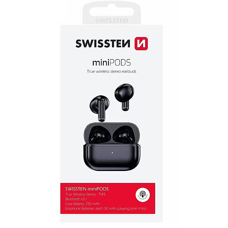 description_ru - Элегантные Bluetooth-наушники TWS SWISSTEN miniPODS для прослушивания музыки со встроенным микрофоном для совершения звонка. Упакован в розничную упаковку SWISTEN.