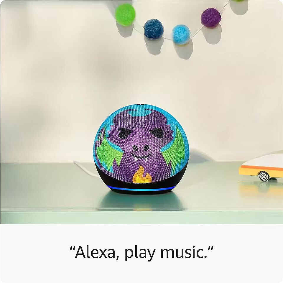 Echo Dot Kids automatically filters explicit songs from Amazon Music, Apple Music, Spotify, or Pandora — so kids can have fun listening, singing, and dancing along with all their favorite tunes. “Alexa, be a dragon.“