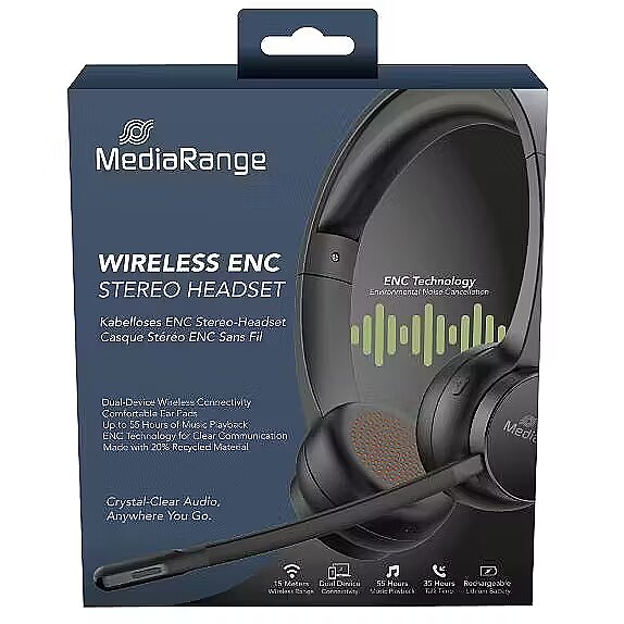 Description - MediaRange Wireless ENC Stereo Headset with rotatable microphone arm, Function Buttons, Rechargeable 400mAh Battery, 2-Device Pairing (BT Ver. 5.2), Black