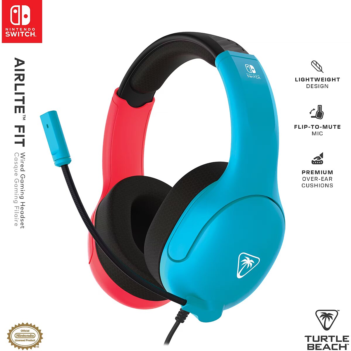 LongSummaryDescription - Turtle Beach Airlite Fit Neon Blue and Red Wired Gaming Headset with Flip-to-Mute Mic, Over-Ear Premium Comfort and 40mm Speakers. Officially Licensed for Nintendo Switch. Product type: Headset. Connectivity technology: Wired. Recommended usage: Gaming. Headphone frequency: 20 - 20000 Hz. Cable length: 1.15 m. Weight: 228 g. Product colour: Black, Blue, Red