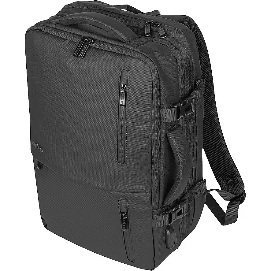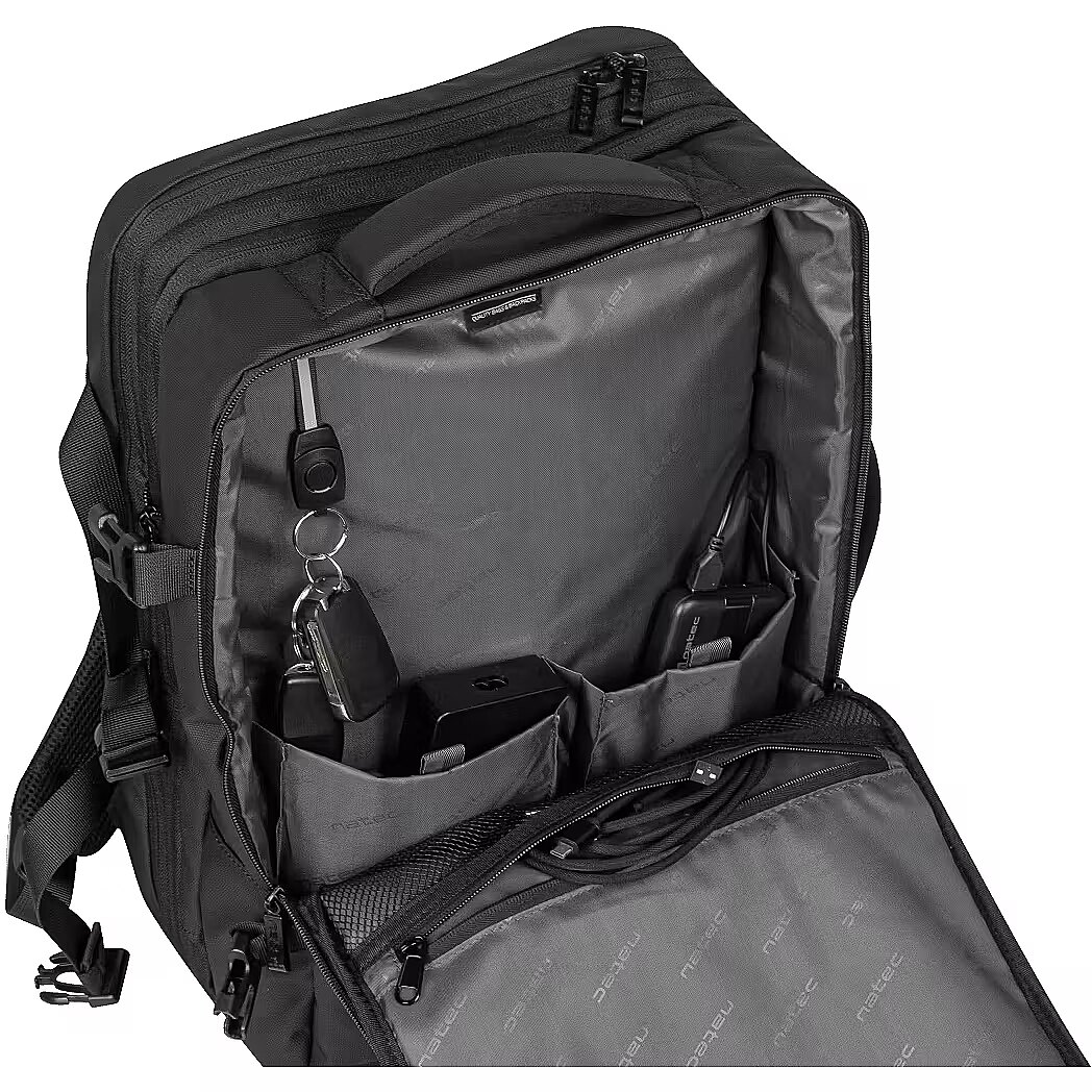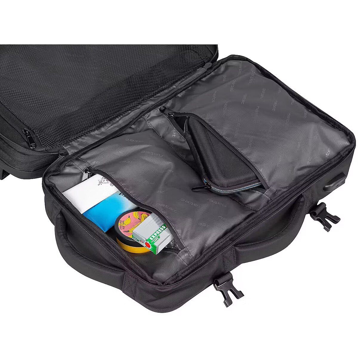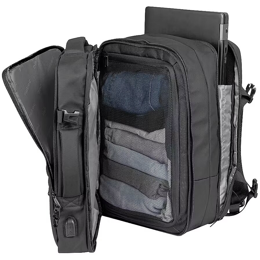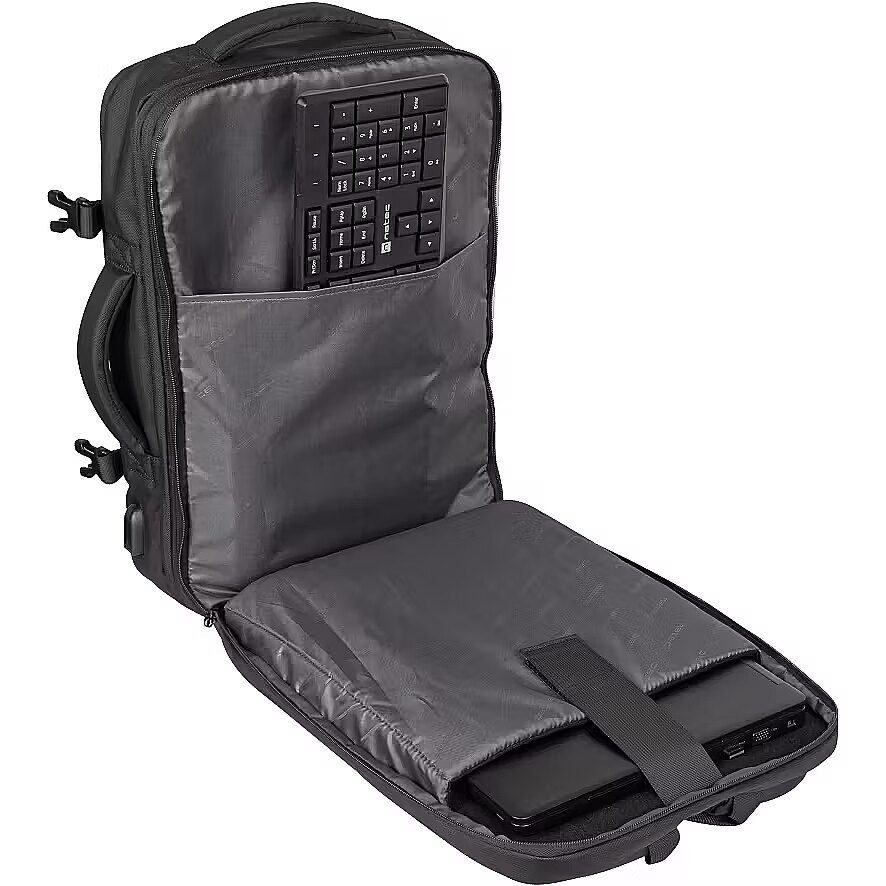 Description - On the ground and in the air. Have the essentials at hand  Meet the Natec Camel Pro - a versatile 2-in-1 backpack that will work great as a city backpack, gear for a long trip and as hand luggage during a multi-hour flight. As many as 3 chambers hidden inside will allow you to carry not only a 17.3" laptop, accessories or documents, but also clothes. Bet on one backpack and forget about extra bags. This is the Natec Camel Pro.  1 backpack and up to 3 chambers  Don't want to limit yourself? With Natec Camel Pro you don't have to worry about lack of space. We equipped our backpack with as many as 3 chambers. The first one is padded with soft material, which will protect your laptop up to 17.3" and additional equipment or documents. What's more, to increase the security of the equipment you carry, you can secure it with a lock. The second is a fully expandable chamber, where you can easily fit your clothes. That's what makes the Natec Camel Pro perfect, for example, as hand luggage on a plane. The third chamber guarantees you plenty of space for free arrangement. Accessories? Wallet? Keys? The Natec Camel Pro has a place for everything.  Even more space  And that's not all. Natec Camel Pro - in addition to 3 main chambers - will give you access to 3 pockets located on the front, and even a dedicated pocket for a powerbank. A special cable slot will allow you to connect your devices to an external USB port and replenish energy whenever you want. Charging on the go? With the Natec Camel Pro, it's easier than ever.  Walk in all conditions  With the Natec Camel Pro you can wander regardless of the weather conditions. Its durability is due to its high-quality material with waterproof properties. On the way to school, on a business trip, or out on the town - no matter where you are, you can count on it.  Wear as you like  Use the soft, fully adjustable harness with chest strap or use the classic reinforced handle. This will be facilitated by the compression function of the suspenders, which will turn your Natec Camel Pro into a roomy bag. What's more. Thanks to the Trolley system, you can easily attach the backpack to the telescopic handle of your suitcase.