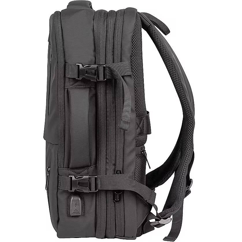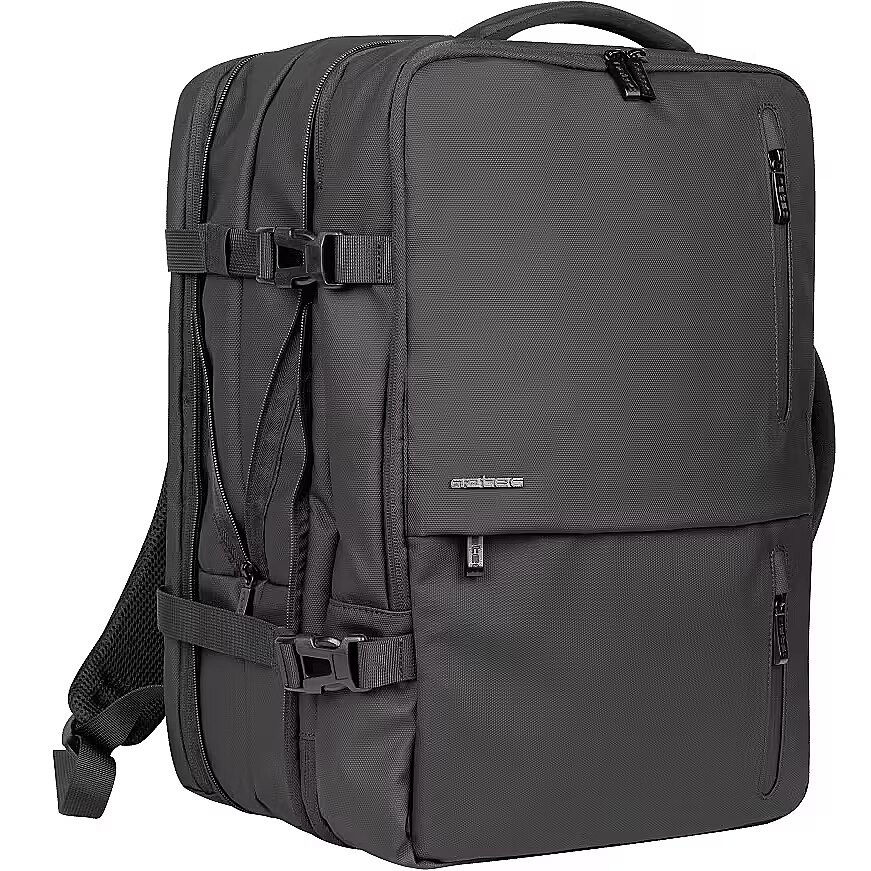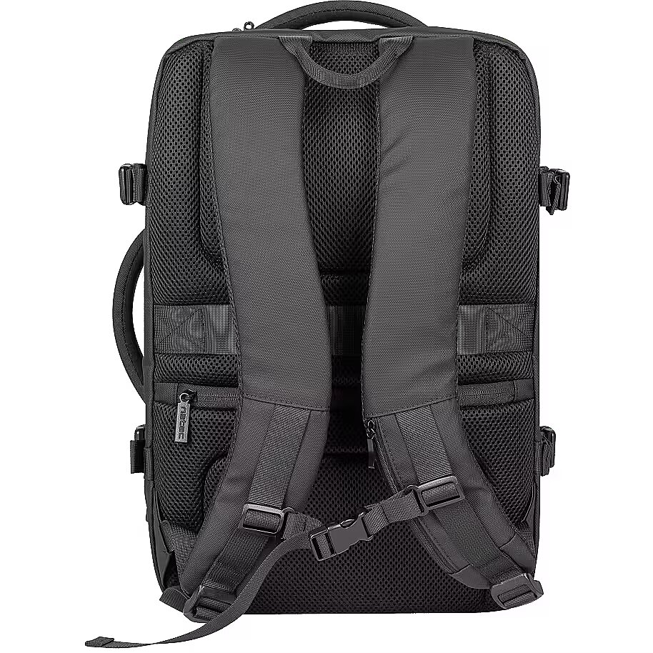 Other features - 2-in-1 travel backpack made of durable, water-resistant material. Equipped with a compartment with a soft padded pocket for max 17,3 laptop and space for additional equipment or documents. Expandable middle clothing compartment makes it perfect as carry-on luggage, or a suitcase for a weekend or business trip. In the central compartment, two zipped pockets for cosmetics or accessories. Front compartment with ample space for free use, a key holder and Velcro fastened and zipped. Powerbank pocket to connect the device to an external USB port. Three pockets on the front with waterproof zippers. Comfortable, soft, adjustable shoulder straps with chest strap and a small credit card pocket. Compressible shoulder straps for increased comfort when carrying the backpack in hand. Soft and sturdy side and top handles to carry comfortably in hand. Padded back panel with additional security pocket to protect valuables from theft. Zippers in the laptop compartment enable to attach the security lock. Trolley system for easy carriage during travel. Side compression straps.