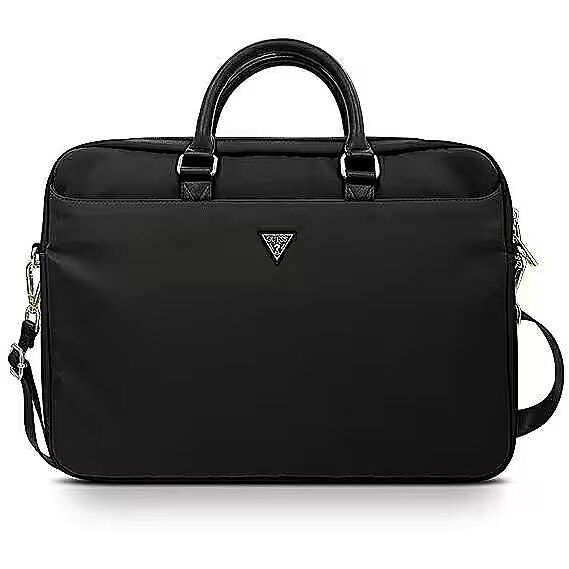 Description - Guess Nylon Triangle Logo Bag A fashionable and stylish laptop bag made of high-quality materials, it gives you the high-end look you expect from the GUESS fashion house. For decades, the Guess brand has been associated with the highest quality and excellent design. The Nylon Triangle Logo collection is an excellent proposition for people who value not only an exclusive look in fashion, but also high quality and functionality. The bag from the Nylon Triangle Logo collection is made of a very nice and pleasant to the touch Nylon. This material is characterized by high durability, very good moisture wicking, is very durable, does not crease, is light and dries quickly. In addition, it has properties that prevent the development of fungi and bacteria on its surface. The bag is signed with a triangle metal Guess logo. The bag has been designed to be carried in the hand and on the shoulder - it is equipped with a detachable and adjustable strap. An additional special strap for attaching to the handle of the suitcase will be very useful during all trips. The bag has a main compartment closed with a double-sided zipper and many compartments to provide maximum space for carrying all the necessary accessories. Two additional external pockets have been provided for small items or additional documents. The product is manufactured under the license of Guess.