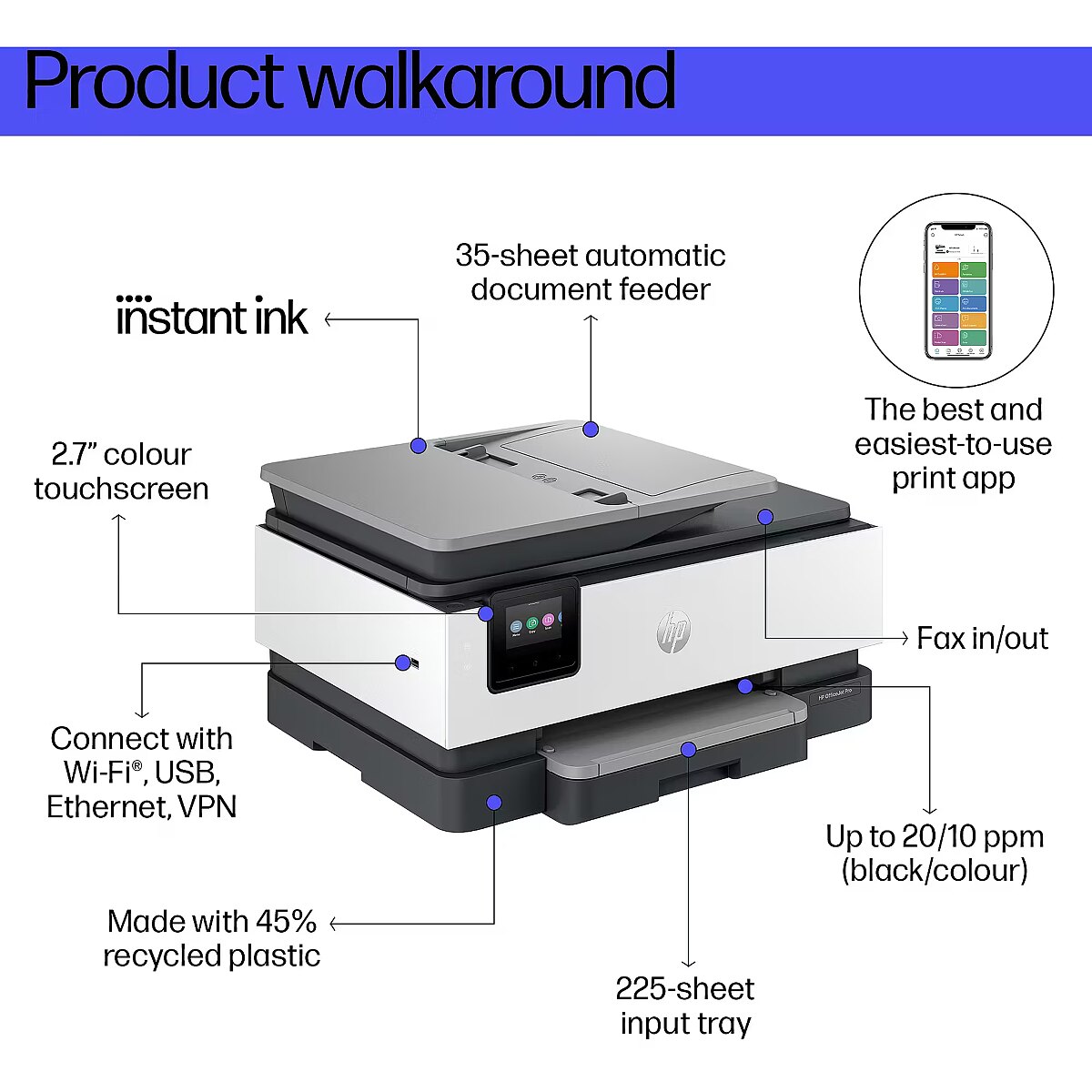 LongDesc - Print at home like a Pro. Say hello to the professional colour inkjet printer for your home office from the World’s #1 Printer Company, paired with the easiest-to-use print app. From notes to presentations, enjoy easy printing designed to make you succeed at work.[1,2]. HP Instant Ink eligibleDynamic security enabled printer Certain HP printers are intended to work only with cartridges that have a new or reused HP chip or electronic circuitry. These printers use dynamic security measures to block cartridges using a non-HP chip or electronic circuitry. Periodic firmware updates will maintain the effectiveness of these measures and block cartridges that previously worked. Reused HP chips and electronic circuitry enable the use of reused, remanufactured, and refilled cartridges.This is an HP+ enabled printer. Choose HP+ at product setup to activate benefits. HP+ requires an HP account, ongoing connection to the internet, and exclusive use of Original HP Ink cartridges for the life of the printer. More at: http://www.hp.com/plus