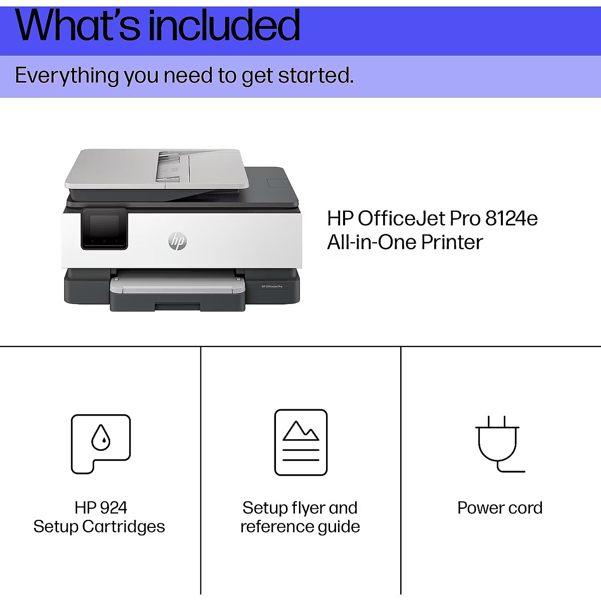Technical details - Box contents - HP OfficeJet Pro 8124e All-in-One Printer; HP 924 Setup Black Ink Cartridge; HP 924 Setup Cyan Ink Cartridge; HP 924 Setup Magenta Ink Cartridge; HP 924 Setup Yellow Ink Cartridge; Power Cord; Regulatory Flyer; Ink Caution Flyer; Setup Poster; Reference Guide
