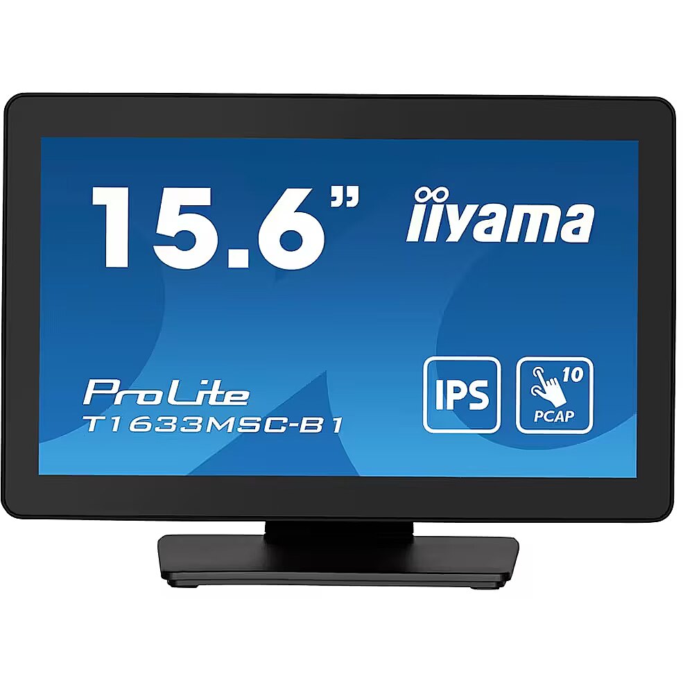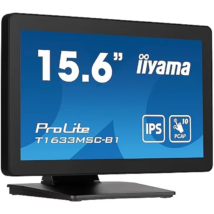 LongSummaryDescription - iiyama ProLite T1633MSC-B1. Display diagonal: 39.6 cm (15.6"), Display resolution: 1920 x 1080 pixels, HD type: Full HD, Display technology: LCD, Response time: 5 ms, Native aspect ratio: 16:9, Viewing angle, horizontal: 178°, Viewing angle, vertical: 178°. Built-in speaker(s). Built-in USB hub, USB hub version: 2.0. VESA mounting. Product colour: Black