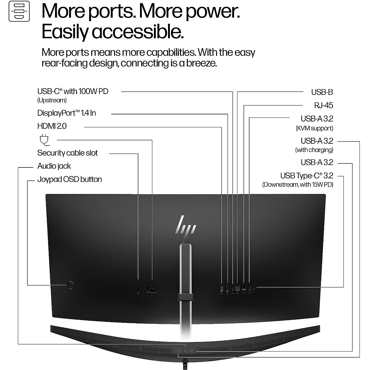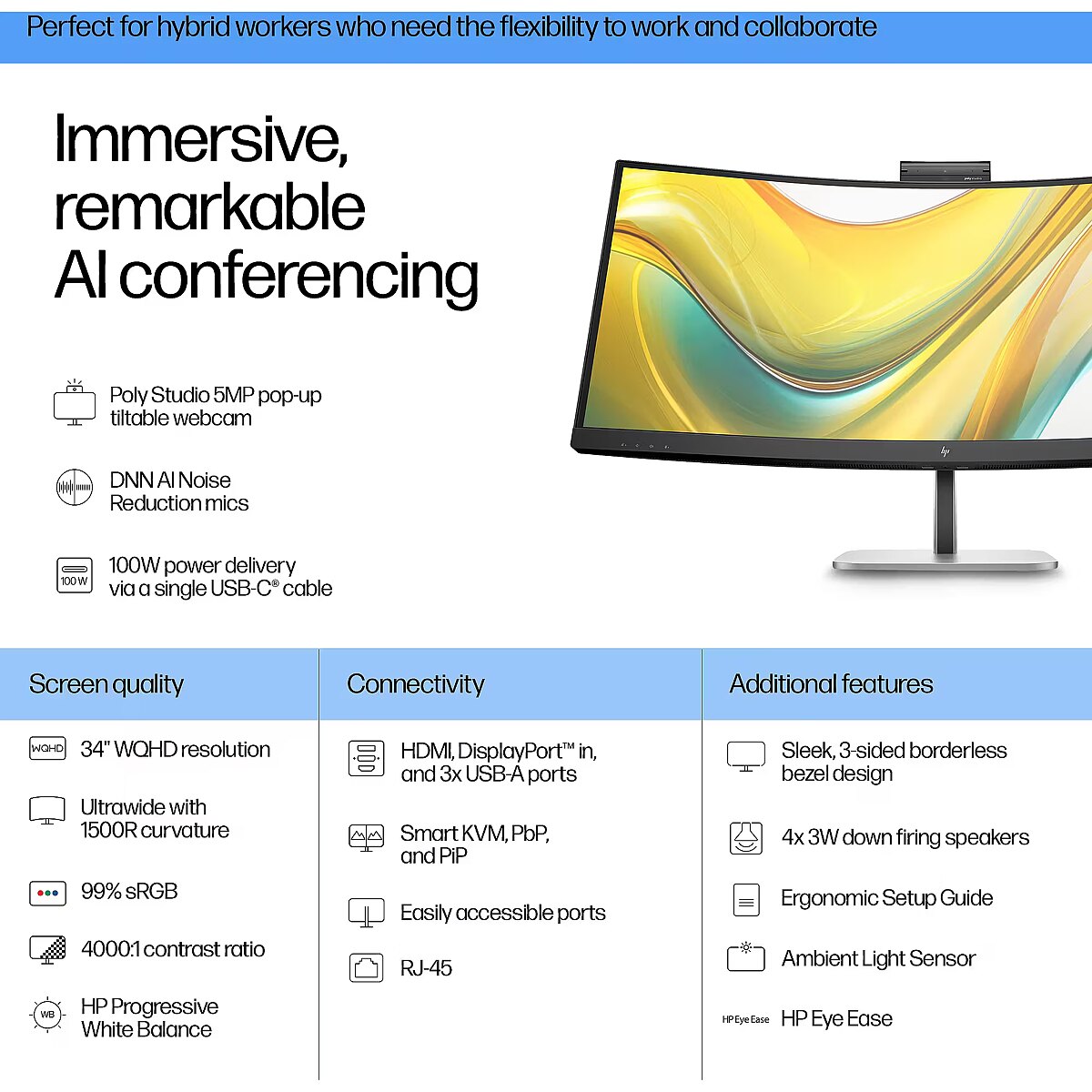 ProdDesc - HP 534pm Series 5 Pro WQHD USB-C Curved Conferencing PVC Free Monitor - 34" 3440x1440 WQHD 400-nit AG, VA, USB-C(100W/15W)/HDMI/DisplayPort, 3x USB-A, speakers, 5MP webcam, RJ-45 LAN, height adjustable/tilt/swivel, 3 years (replaces E34m)