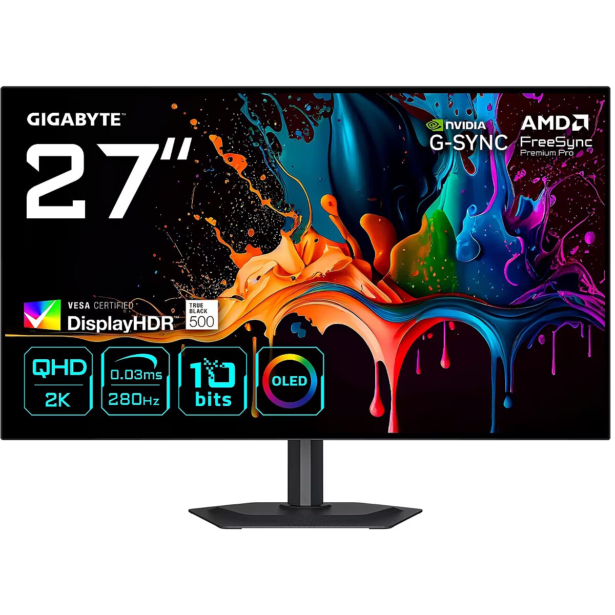 ShortSummaryDescription - GIGABYTE MO27Q28G 27" OLED QHD Gaming Monitor - 2560 x 1440, 280Hz, 0.03ms, 335 cd/m², Display HDR True Black 500, HDMI 2.1, Displayport 1.4, 68.6 cm (27"), 2560 x 1440 pixels, Quad HD, OLED, 0.03 ms, Black