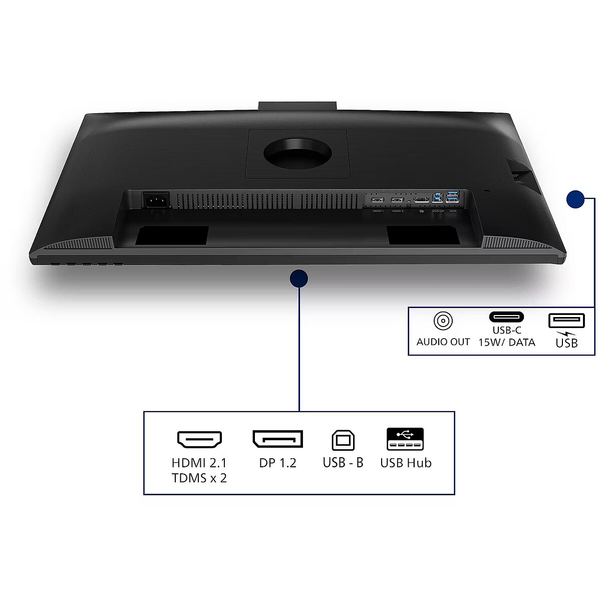 Several USB-C ports make the monitor more versatile for modern devices. Each port can simultaneously transmit video, audio, data and power through a single cable, reducing the number of wires. This allows to connect multiple peripheral devices or signal sources without additional adapters.