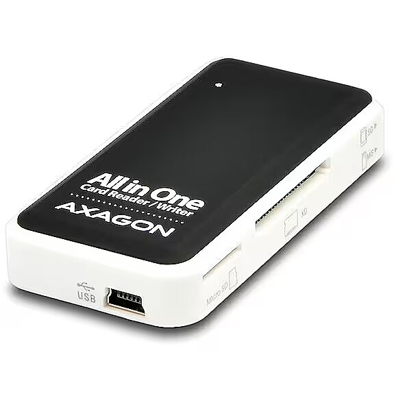 ShortSummaryDescription - Axagon CRE-X1 external 5-slot reader of memory cards, CF, CF Type II, MMC, MMC Mobile, MMCmicro, MS Duo, MS PRO, Memory Stick (MS), MicroDrive, MicroSD..., Black, White, 480 Mbit/s, Plastic, CE, RoHS, USB 2.0