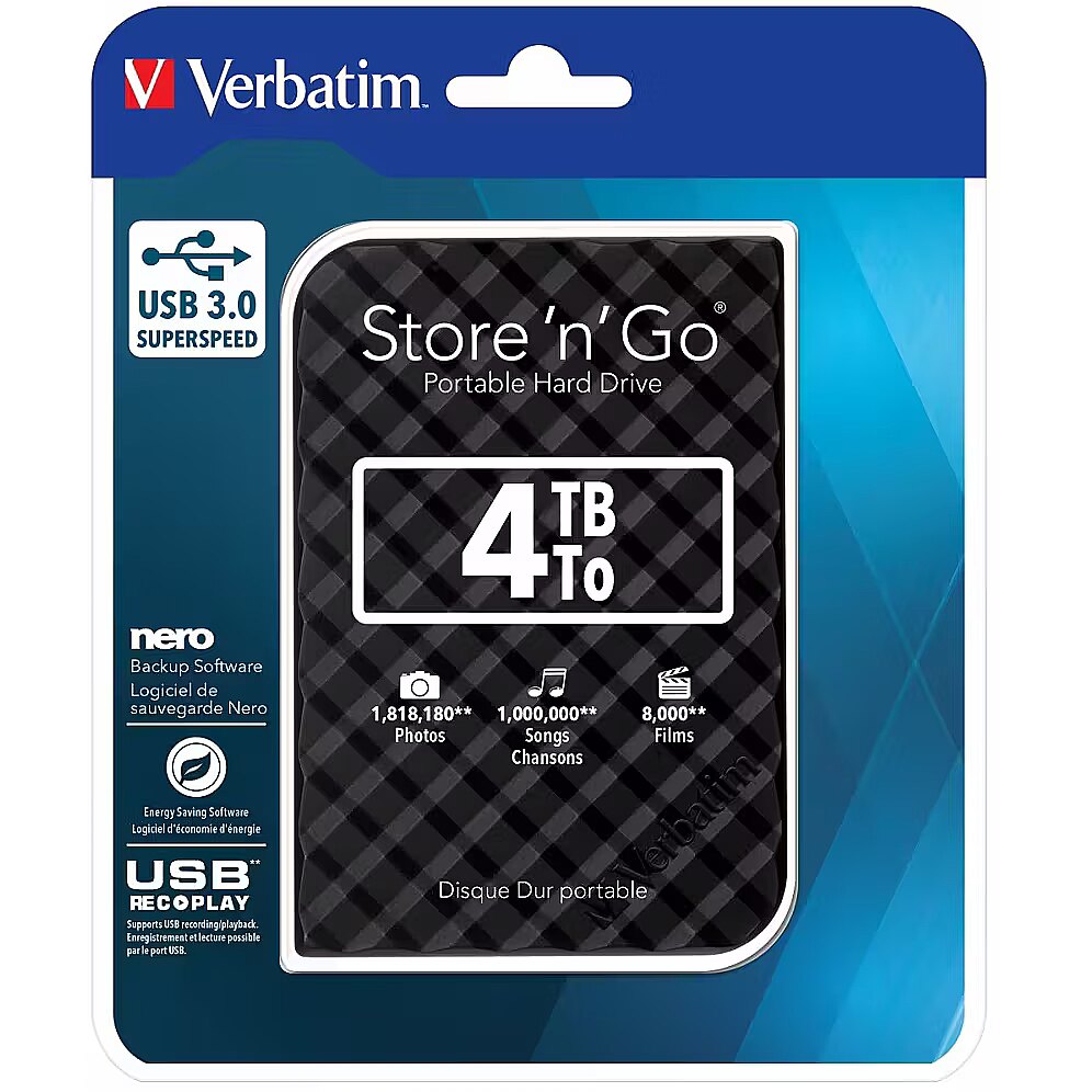 LongDesc - - Colours available: Black, Silver, White, Red & Blue- High speed, high capacity storage. A fast & safe solution to expand storage or backup files- USB 3.0 SuperSpeed - for ultra fast data transfer- USB plug 'n' play (no additional power required)- Nero Backup Software- Energy Saving Software - USB REC & PLAY - supports USB recording/ playbackThe Verbatim Store n Go portable hard drive features high performance storage using a USB 3.0 “Super Speed” interface. USB 3.0 offers up to 10 times faster data transfer rates than USB 2.0 (based on USB bus speed) providing ultra fast data transfer on the go.Store and carry your digital and day to day working files on this truly mobile drive. Its stylish design sits neatly on the modern desk top as the perfect accompaniment to your laptop.Store n Go portable hard drive is USB 3.0 bus powered (1 x USB 3.0 interface) yet is backwards compatible to any USB 2.0 ports on your PC or notebook. The drive requires no external power for operation; simply plug n play.Drives that are 2TB or under are formatted in FAT32 allowing them to operate immediately on Windows and Mac OSx. Drives above 2TB are formatted in NTFS which is compatible for Windows systems but require Mac users to reformat the drive to HFS+ to make them fully compatible with Mac OSx operating systems. HFS+ formatting can be applied by using the Verbatim VHD Formatter which is on the drive.For added security Nero Backup software is provided to help back up your laptop or PC's hard drive. Backup provides an application to back up all your files, folders, and drives whenever you want, or schedule the auto back up to a set time for added security.Nero Backup Software is compatible with Windows XP, Vista, Windows 7, Windows 8 and Windows 10 (not compatible with Mac OS).Verbatim Store 'n' Go Portable Hard Drives also come with Green Button energy saving software. Green Button software suspends the hard drive from spinning while not in use increasing efficiency and saving energy.There are 3 'Sleep Setting' options. Set the suspend mode to come in after 10 minutes of use, or by increments of 10 minutes up to 120 minutes. Set the drive to suspend immediately by double clicking the Green Button icon on the desktop, alternatively you can set the drive to 'Never Suspend the disk'This range of Hard Drives is available in 5 colours: Black, Silver, Blue, Red and White.