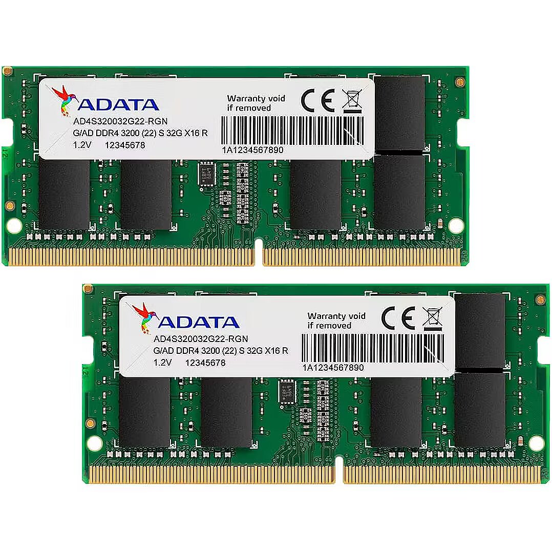 LongSummaryDescription - ADATA AD4S320016G22-DTGN. Component for: Laptop, Internal memory: 32 GB, Memory layout (modules x size): 2 x 16 GB, Internal memory type: DDR4, Memory clock speed: 3200 MHz, Memory form factor: 260-pin SO-DIMM, CAS latency: 22