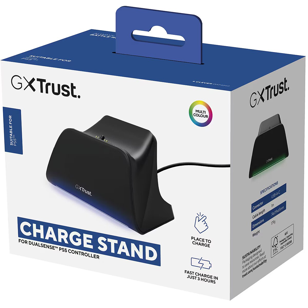 LongDesc - Quick charge stand for PS5 controllersGXT 255Fast charging stand for PS5 controller with multicolour LED and charging indicatorCharge into battleGet your PS5 controllers up and ready to go in no time at all. Specifically designed for your official DualSense™ controller, this Quick Charge Stand will have your controller fully charged in less than three hours. Let’s go!Click in with colourCharging has never been more simple. With a place-on design, click your controller into the dock with ease. Want to make sure it’s charging? We’ve got you! The dock’s multicolour LED lighting lets you know when it’s charging and fully charged, and looks awesome too!Stable and simpleLess hassle, more hustle. With an anti-skid pad, this Quick Charge Stand isn’t going anywhere. What’s more, it comes with an included USB-C-C charging cable to easily connect straight to your PS5 or wall power adapter. Easy as pie!